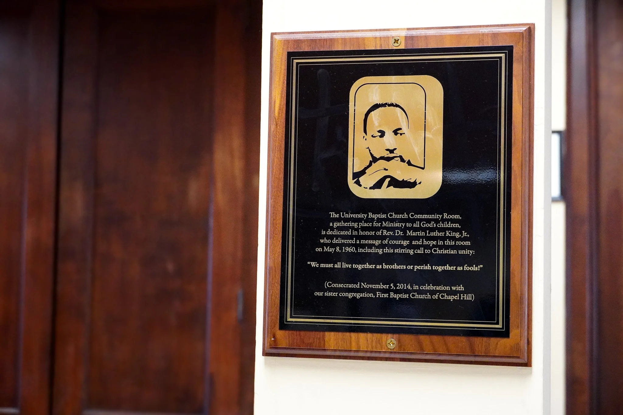 The MLK Community Room at University Baptist Church is named in honor of Dr. Martin Luther King Jr., who spoke here on May 8, 1960, during a visit to UNC. His visit was sponsored by the UNC Baptist Student Union, and while he was welcomed to speak, members of our church at the time did not offer him space in the sanctuary. Instead, he was invited to speak in what was then our downstairs Fellowship Hall—now the MLK Community Room.